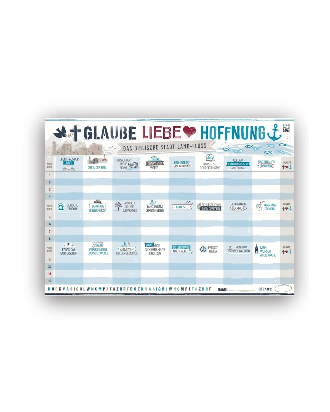 Du bist ein echter Fan vom lieben Gott und kennst dich in der Bibel aus? Bei diesem Wortquiz heißt es in 12 Spielrunden passende Begriffe mit einem zuvor ermittelten Anfangsbuchstaben zu finden. Dabei ist nicht nur Wissen und Kreativität gefragt, sondern auch Schnelligkeit. Und für extra Spielspaß sorgt ein Wechsel der Kategorien nach jeweils vier gespielten Runden.